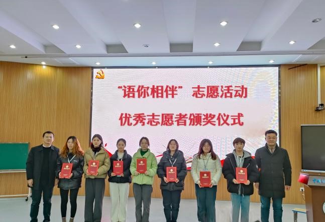 党委副书记余尚蔚为“语你相伴”志愿服务队授旗,并与周良军副校长共同为“语你相伴”志愿服务队优秀志愿者颁发荣誉证书。在一片热烈的掌声中,周良军副校长宣布“语你相伴”志愿服务队2024年支教活动正式启动。支教队队长曾令文表示:“接过旗帜就是一份责任,也是对学习成长的期待,获颁荣誉证书不仅是对我们过去努力的肯定,更是对未来工作的鞭策和激励。我们将以此为契机,继续发挥自己的专长和优势,为附属学校的孩子们带去更多的智慧和启迪,为支教事业贡献更多的力量。”
