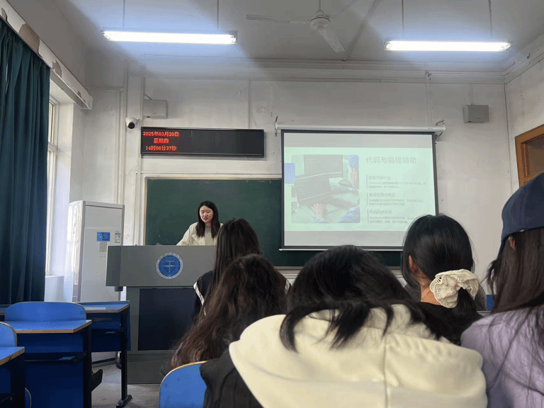 活动伊始,主持人以“技术赋能学习”为引,揭开序幕。杨书蕙同学从“认知科学视角下的语言习得规律”切入,结合AI工具在单词记忆、听力训练中的实际应用,提出“精准输入+高频输出”的高效学习模型;覃梦媛同学则分享个人学习英语流畅表达的经验,强调日常学习英语的重要性。随后的交流环节,两班的同学们围绕“如何突破口语焦虑”“AI辅助学习的边界”等问题与彼此展开对话,在进行头脑风暴的同时也拉近了两班同学之间的距离。