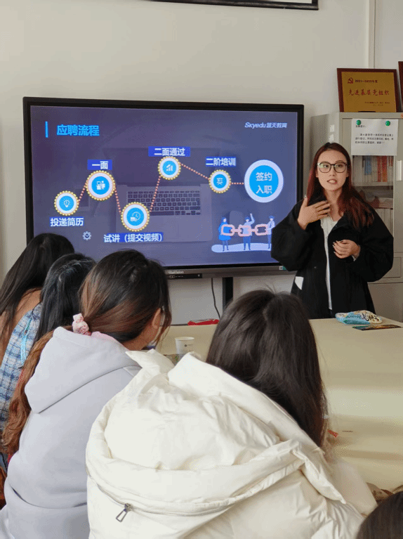 宣讲会上,两位HR首先分享了毕业后加入深圳蓝天教育的职业发展历程。她们以职场新人的视角切入,讲述了自身如何通过充分规划和持续学习逐步成长为优秀英语教师的发展经历。随后,她们详细介绍了此次深圳蓝天教育的招聘信息、国产自拍、培训体系以及职业发展路径,让与会同学们加深了对蓝天教育集团的了解和期待。