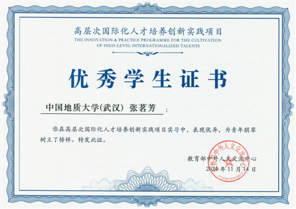 2022级外国语言文学专业硕士研究生张茗芳因在高层次国际化人才培养创新实践项目实习中表现优异,受到教育部中外人文交流中心表彰,荣获了优秀学生证书。此外,张茗芳同学获上海合作组织秘书处实习岗位录用通知,这是我校在校大学生首次获得政府间国际组织实地实习岗位。同时,张茗芳同学也是2024年度研究生国家奖学金获得者,充分展示了学院严谨优良的学风和卓越的人才培养质量。