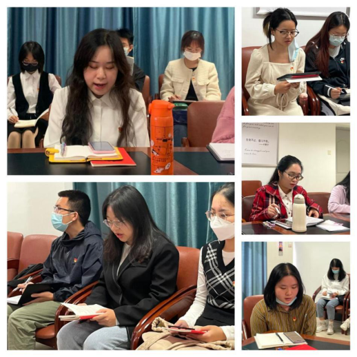 其中,来自本科生英语+工商管理班党支部的谢怡欣从自己作为中共预备党员、学生骨干和外语学子这三个角色出发,感受到当代中国青年生逢其时,实现梦想的前景无比光明;唐湘林和沈婧怡同学则是对党十八大召开至今所经历的对党和人民事业具有重大现实意义和深远历史意义的三件大事深有体会,同时表示作为学生党员,将在学习、生活和工作中发挥模范带头作用。本科生英语2班党支部的梁宇颖谈到自己亲身目睹并深刻体会到了党为人民福祉付出的努力与取得的成就。2021级研究生第二支部王紫璇和2020级研究生第一支部的冯月都结合了所学的翻译专业,表示自己应学好专业知识,进而讲好中国故事,传播好中国声音,推进中国文化更好地走向世界。